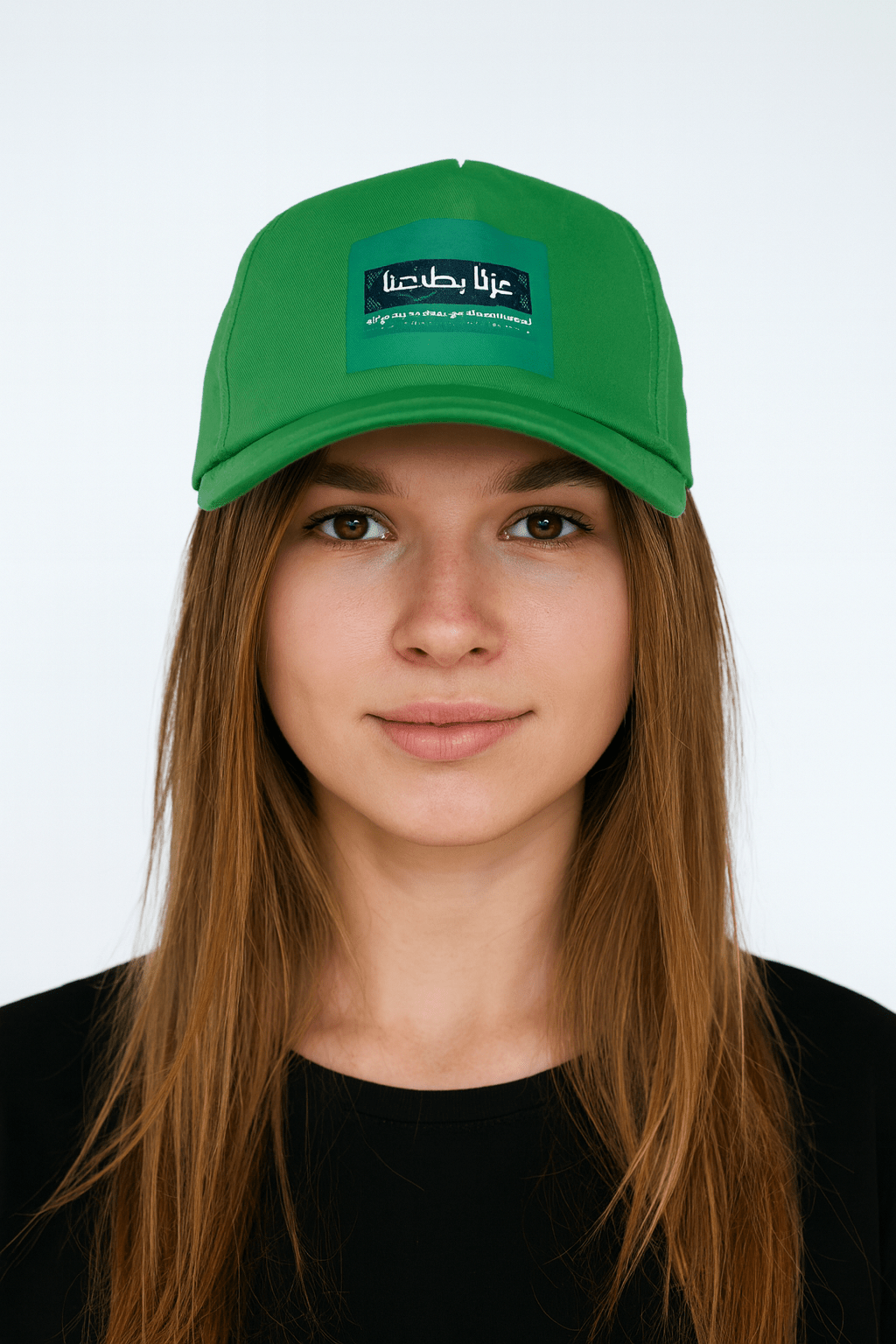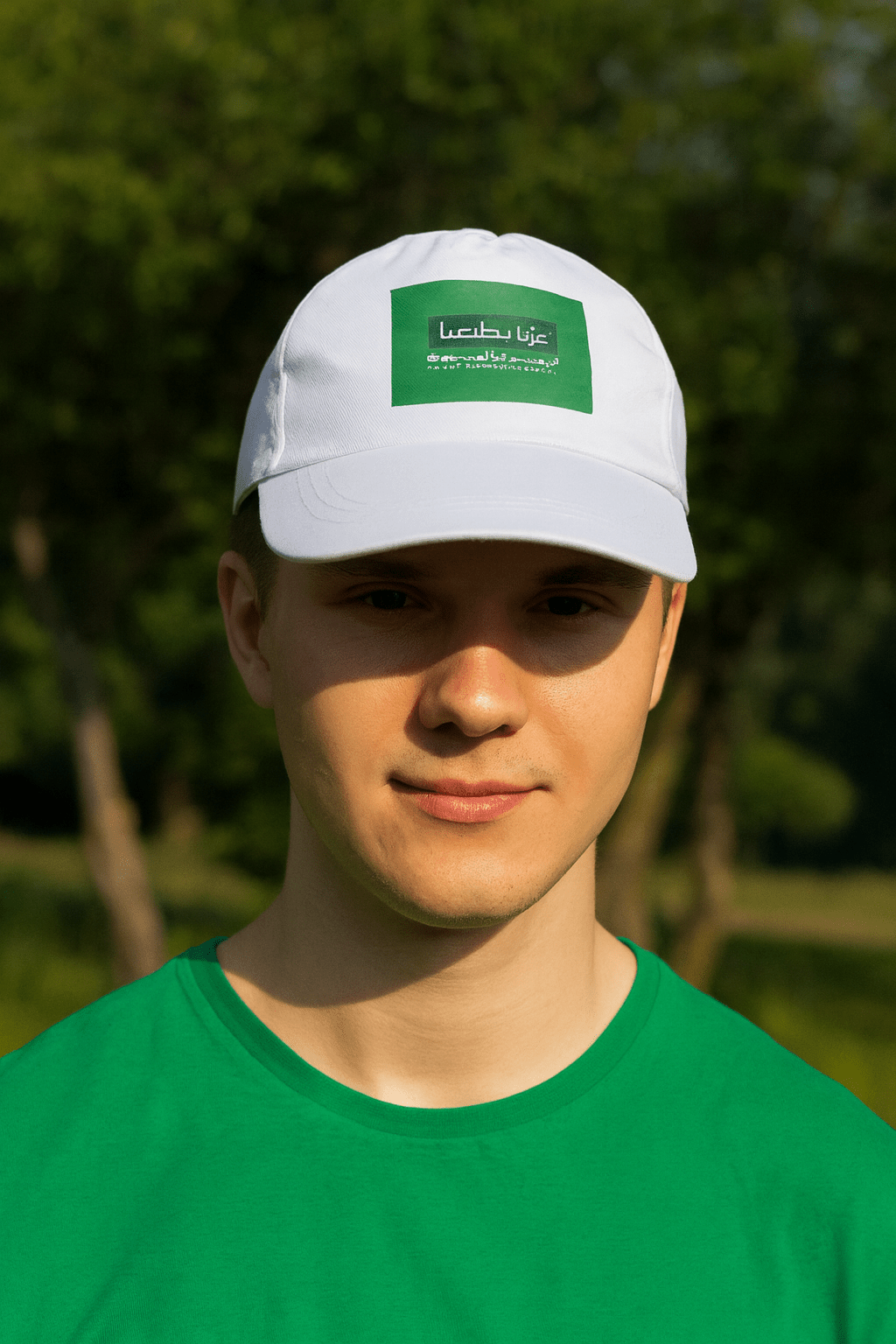Saudi National Day Cap – A patriotic baseball-style cap available in white or green, featuring the 95th National Day slogan "عزنا بطيبنا". Perfect for celebrating in style.