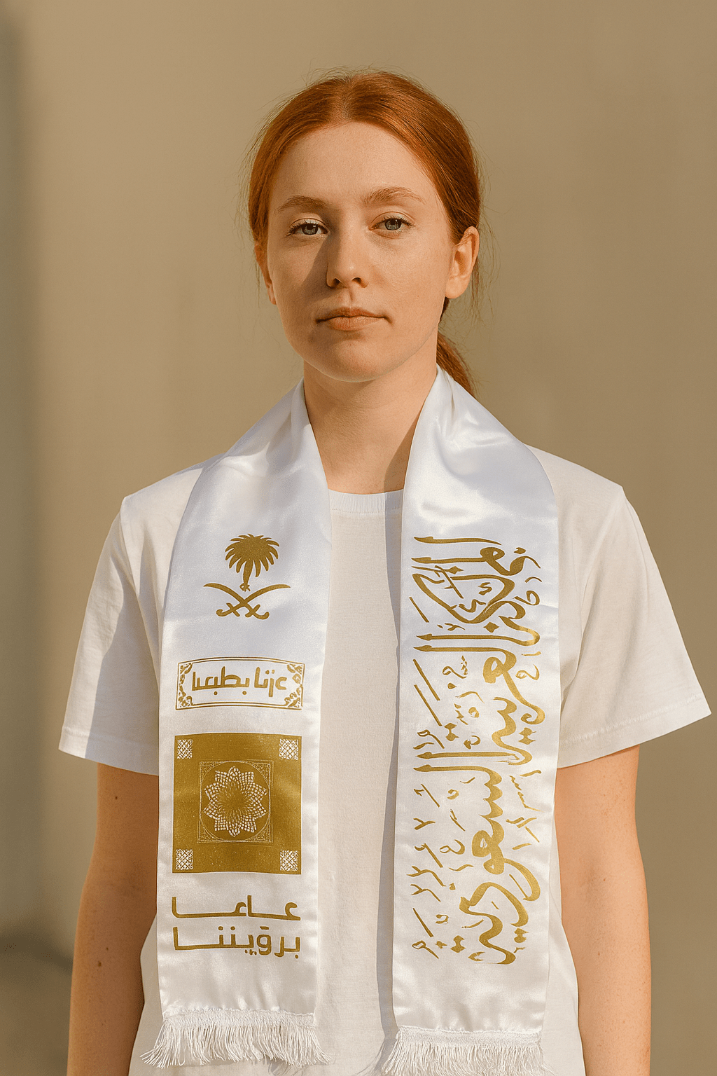 Saudi National Day Satin Scarf – A commemorative scarf featuring elegant Arabic calligraphy and patriotic symbols, perfect for celebrating the Kingdom’s 95th National Day.